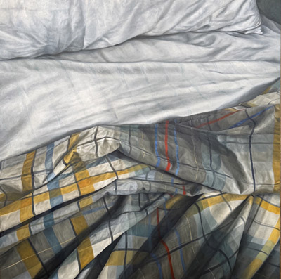 In her current series, The Nocturnal Landscapes, she explores the nature of what a landscape can define by using photos sent to her from loved ones of the marks they have left from their previous night’s sleep. These landscapes are an homage to the amazing dream realm traveled during slumber and the traces of which are left in the physical world. She takes comfort in the fact that the subject of sleep and dreaming is a universal activity that transcends time, class, race, religion, or location on the globe. Her paintings are visual representations of the mystery of sleep, dreams, memory, and the beauty in even the most transitory actions.
