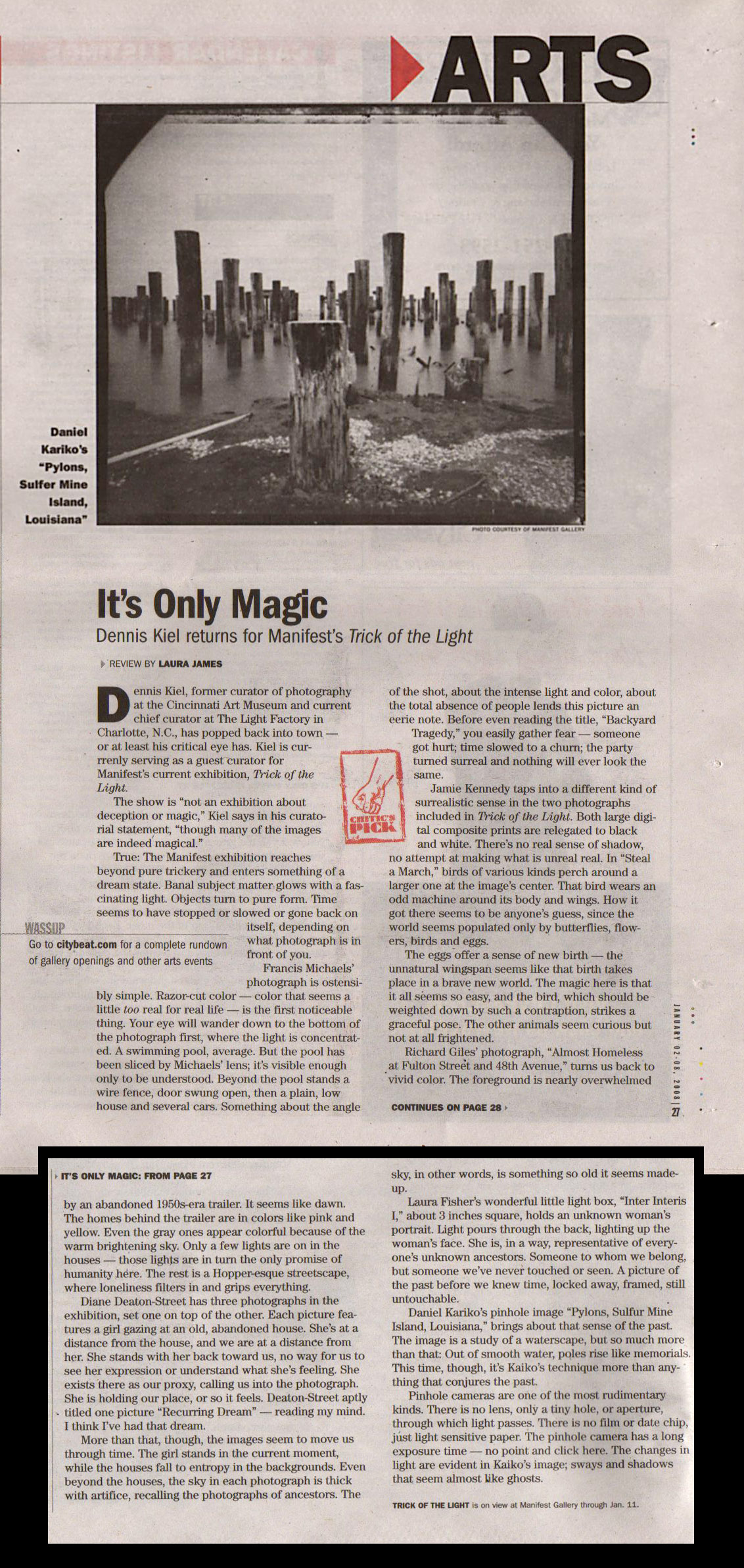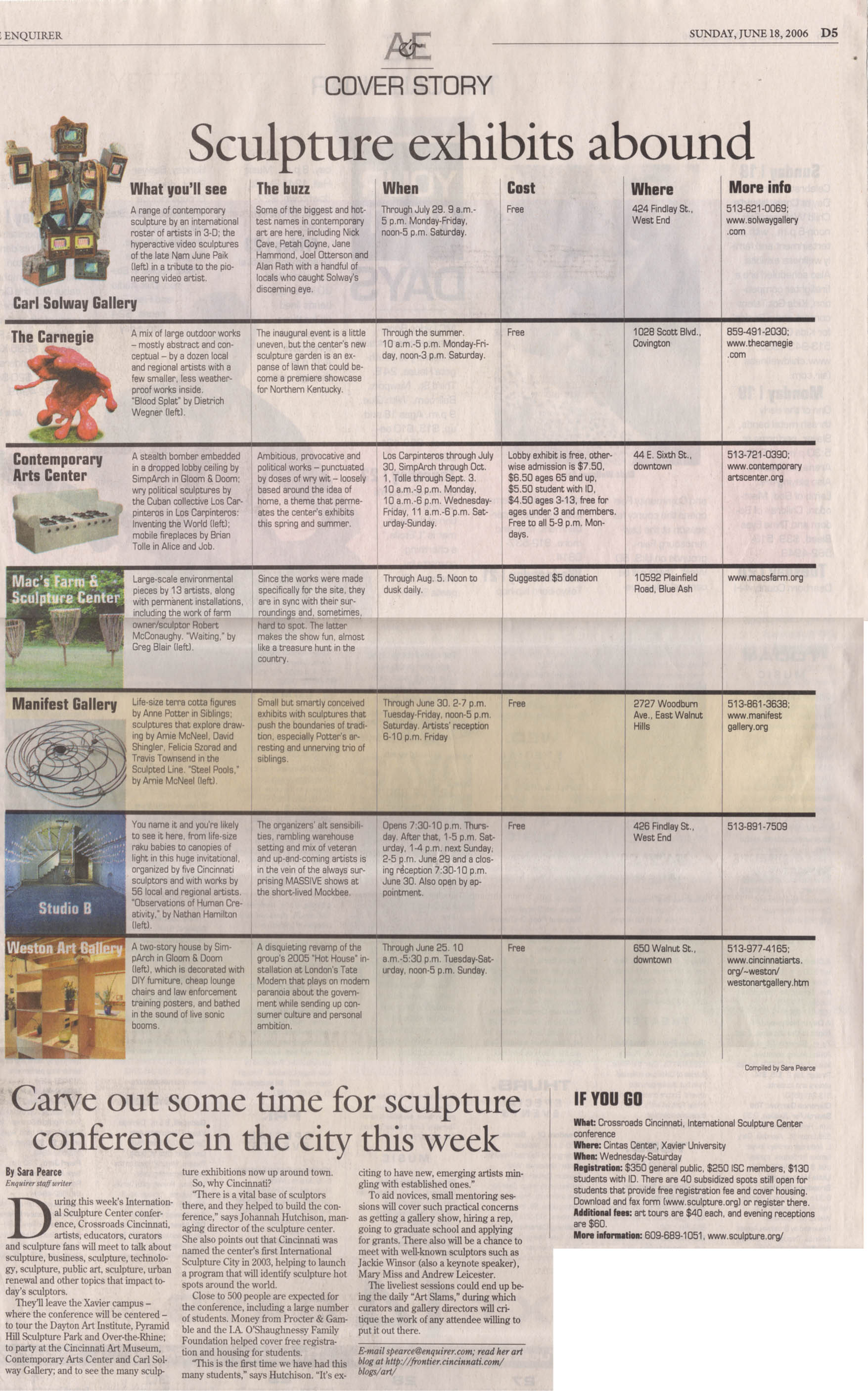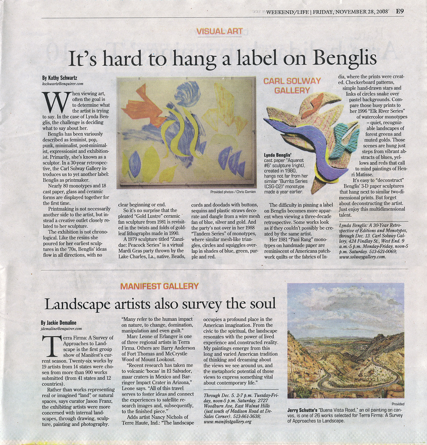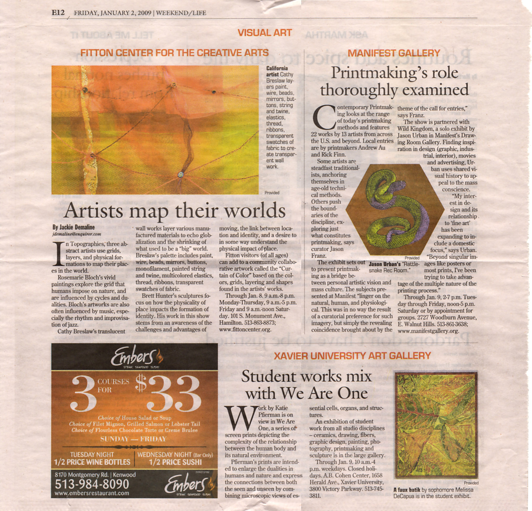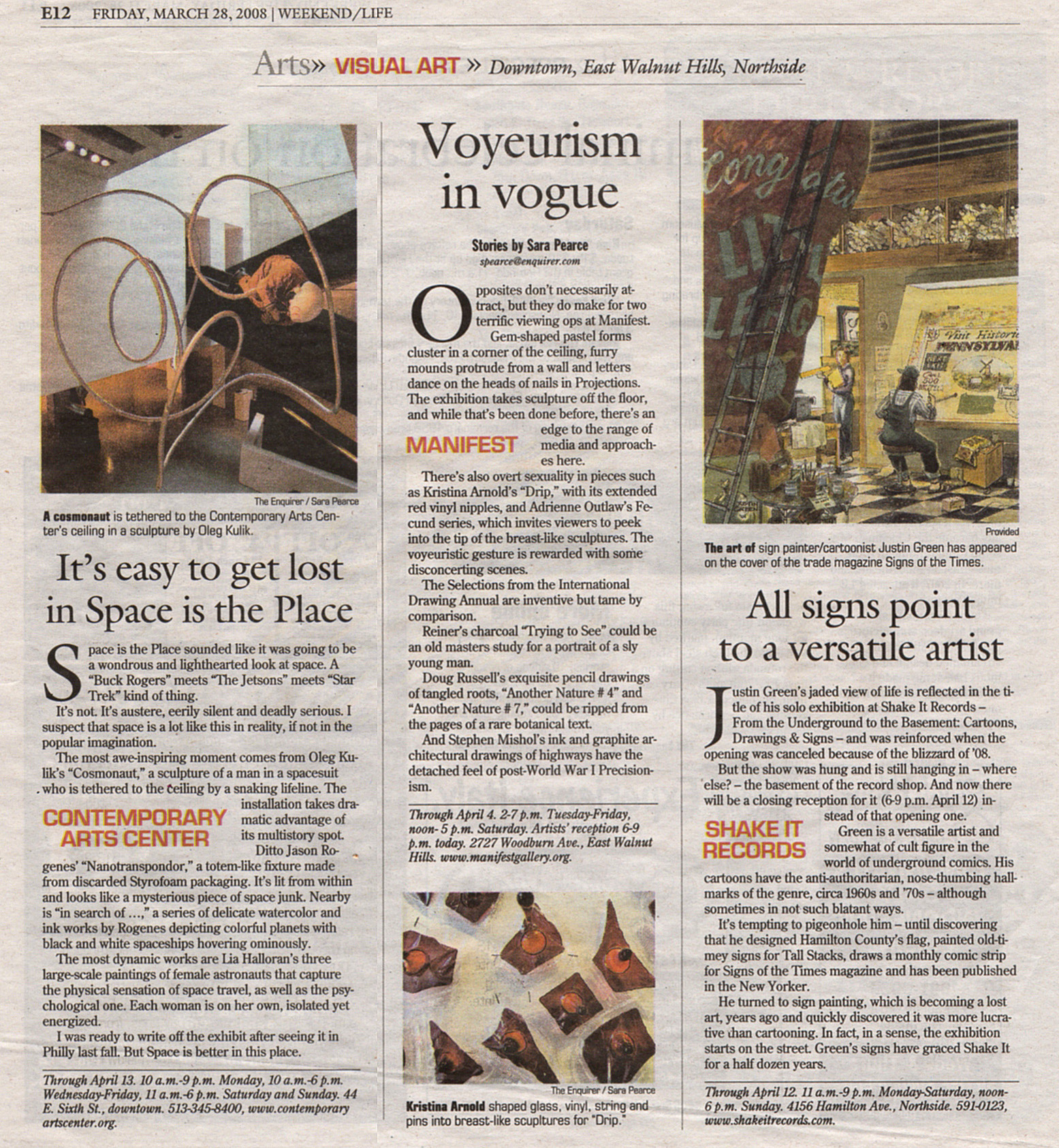 "In fact, Manifest is like a smaller version of the Weston Gallery in the City's Aronoff Center, also known for its superior exhibitions and installations; both spaces reflect the impeccable standards of their respective directors...."