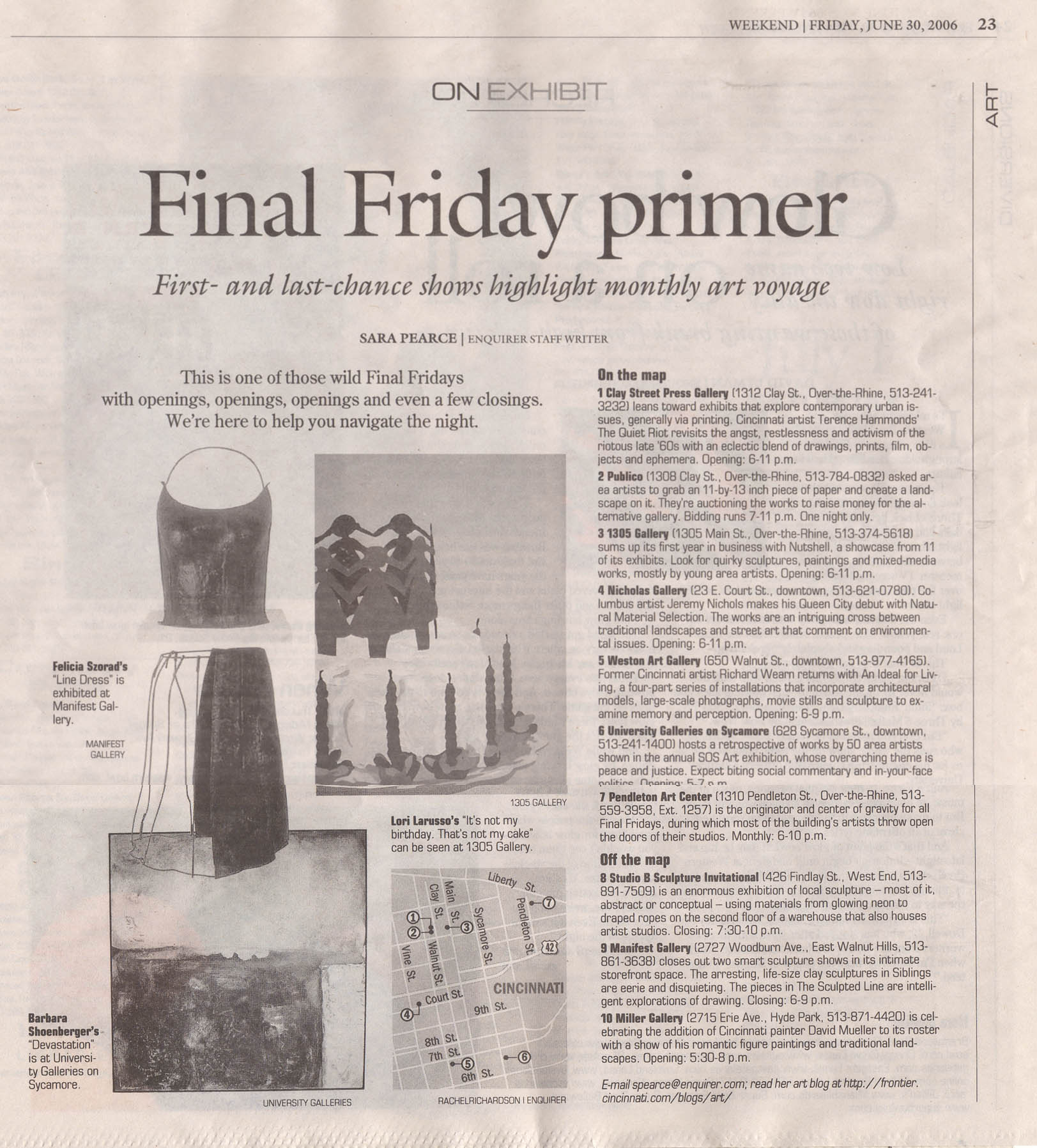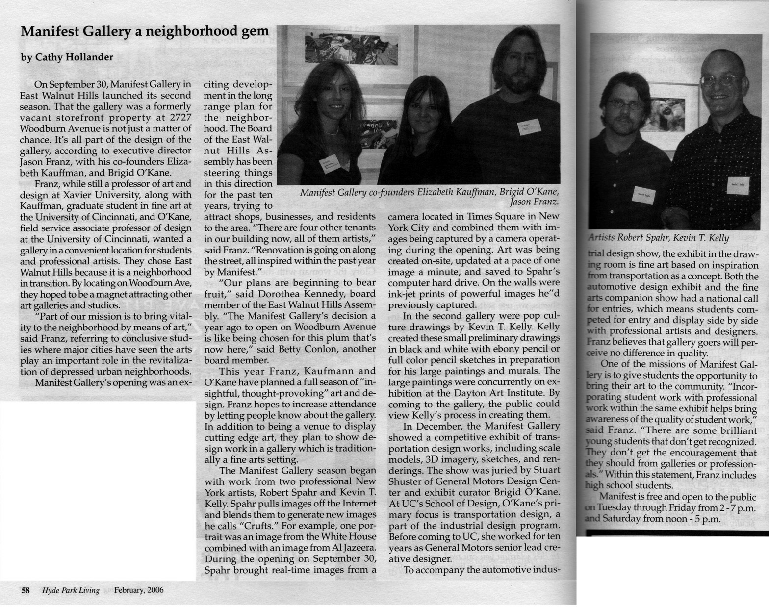 Arteries Talk Show - Guest hosted by Jane Durrell, regional arts critic, and Dennis Kiel, associate curator of prints, drawings and photographs at the Cincinnati Art Museum. Jason Franz, co-founder of Manifest, joined Lily Mulberry of Gallery 1305 (Main Street) for a one hour live radio discussion about the two galleries. Noon - 1:00 pm June 11, 2005. Listen to the interview.