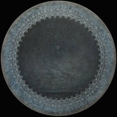 Many Moons Of her work the artist states: "In my work I desire to create a generative space that tethers us as one in the vastness of the cosmos and the voids between, communicating what cannot be seen but felt – the vibrations that are part of us all, echoes from billions of years ago.... As a “conceptual voyager” I play with cosmologies created when scientists and artists imagine, making work that posits, as George Johnson suggests science does, “…a glorious human construction, an artful fitting of the data into a carefully crafted mental framework, a construction of towers that just possibly might have been built another way.” I hope in my work to create a shimmering body of work coalesced in the uneasy thin space between what I do and don’t yet understand and the erotic dark energy threading me to all.”