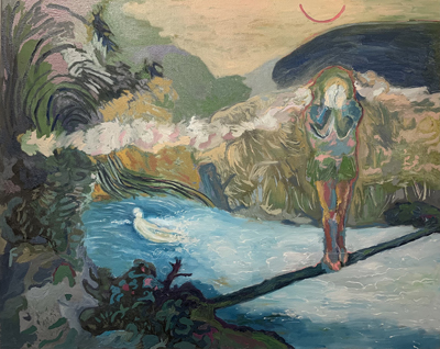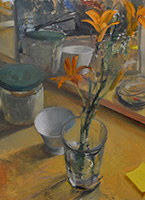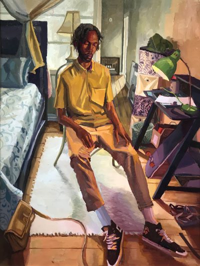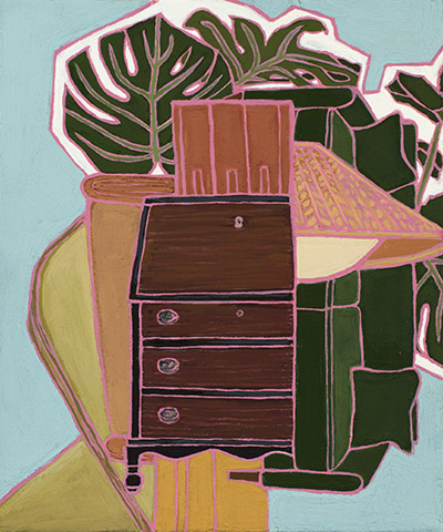 Of her work the artist states: The pictorial relationships, which reflect both the past and the present, are laden with time and memory. Each constructed space creates room for confusion and contemplation. Through playful patterns, furniture, and an ever-evolving collection of plants, these paintings engage with internalized expectations of traditional feminine roles as I consider my life in comparison to the women in my family who came before me. This navigation of generational history and individual experience serves as the starting point for an ongoing exploration of identity and the process of settling into one's self. "