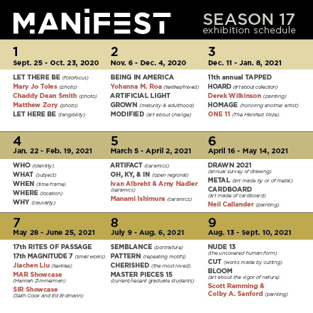* Due to pandemic-related impacts affecting artists and availability of works, installations may vary. Some works will not be on view in the gallery. All jury-selected works will be featured online in social media features, shared in the VR Tour linked from this page, and published in the Manifest Exhibition Annual. |