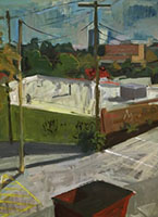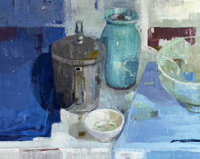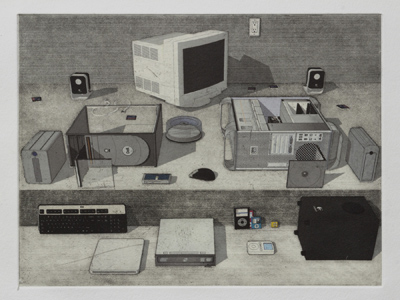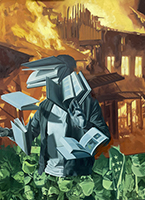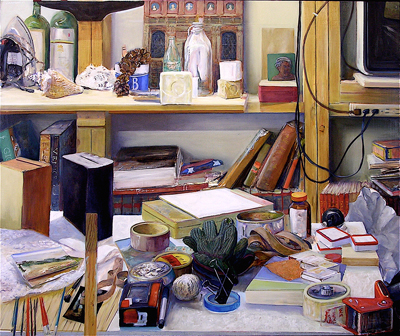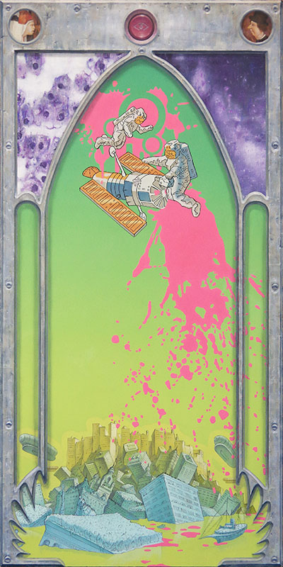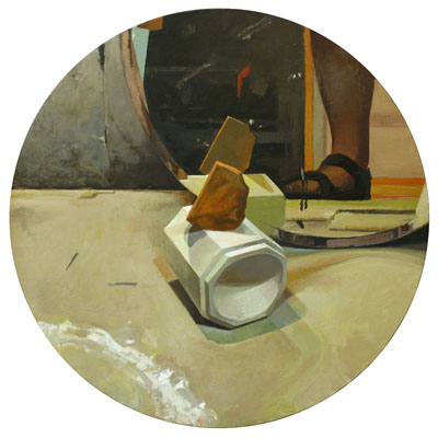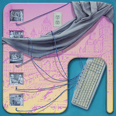 "In my paintings, I examine the present day through the lens of past predictions dating from the 1950's - 1980's. These forecasts, found in scientific journals and science fiction, saw beyond the year 2000 to a variety of outcomes whether hopeful or fearful of the future. Some theorists wrote of the potential for space travel, new technologies, and stability of life while others predicted a darker turn in nuclear annihilation, fear of the unknown, and a continuing lack of resources. Now that we exist within this future, we are able to see that very few of those outcomes took place directly, yet they set into public awareness the dangers and positive innovations that were becoming possible as time advanced. So, while neither prediction was necessarily true, elements of each did occur. I am interested in portraying these fantastic events alongside painted representations of everyday household items that act as symbolic tokens and serve as access points to the intangible.