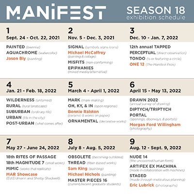 For this exhibit 40 artists submitted 168 works from 20 states and 2 countries, including Canada and the United States. Ten works by the following 8 artists from 7 states were selected by a blind jury process for presentation in the gallery and the Manifest Exhibition Annual publication.