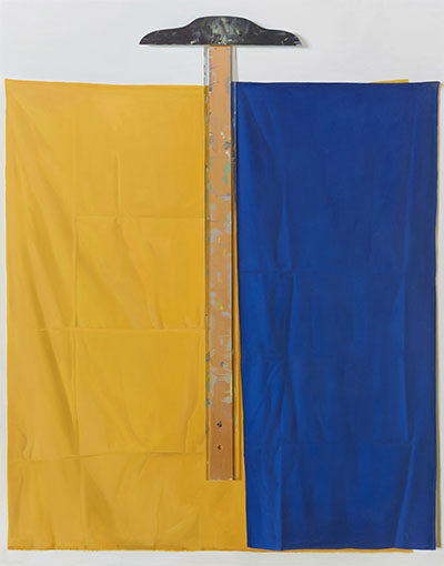 Of his work the artist states: "The T-Square in this painting belonged to my grandfather William Schickel whose modern artistic career spanned architecture to photography sculpture and painting. I never saw a traditional office space as a kid but my grandfather’s studio with its rulers, tracing paper, paint and bent metal was my example of what a working person looked like. Always busy, my grandfather’s mantra was art is life—life is art, which fit a moral view of the world informed by his Catholic faith. Aesthetics and rightness were synonymous pursuits that I had to untangle in my own development as a mature artist, but the ease of making and looking at the world through an artist’s lens is a kind of permission I am thankful to have been given. I teach at the University of Cincinnati and have spent some time working with fashion design students. Basic materials are inherently beautiful to me, and even though I marvel at how my design students can craft and detail garments, the fabric itself is where I see the most magic. This painting is simple: expanses of gold and blue fabric divided by a T-Square. It’s not meant to be topical, but if you think it is, well that’s lovely too."