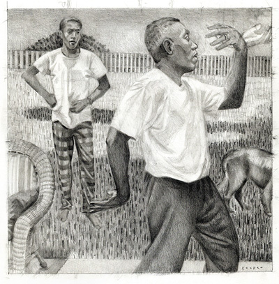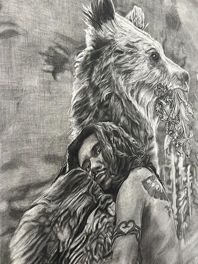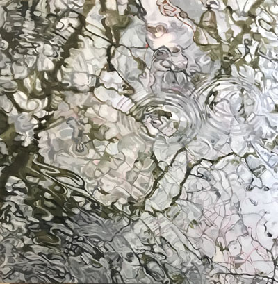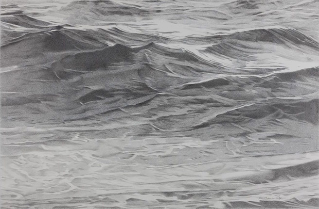 Of her work Cox states: The act of laying graphite down onto paper is personal, intimate, and immediate. It is just me, the pencil, and the paper. When I put pencil to paper there is no disguise, no veneer. The clatter of life is distilled into quiet simplicity the moment I begin. My inspiration comes from the natural world. Rocks, sticks, trees, and rope fascinate me not only in their simplicity as objects, but in how they can address the complexities of the human condition. Most recently the expanse of skies, water, and wind has captivated me. I can hold a rock or a stick. I can rub my palm along a tree trunk, I can feel the coarse fibers of rope. These are objects I can contain. A fast moving river, the depths of the ocean, cloud formations illusively changing with the wind—these I cannot contain and I am reminded that I am small. Drawing these ever-present natural objects and scenes through intense observation quiets me and connects me to both the grandeur and frailty of life. Graphite and colored pencils are my primary tools, and paper is integral to the image, not simply the surface which holds it. Paper surface and marks synthesize, yielding a single seamless result. The interaction between tool and surface is alive and vital, bringing forth imagery.