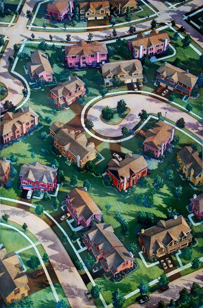 main gallery and drawing room BURB By the end of the twentieth century, suburbia became the place where over half of all Americans live and work. More than just an American phenomena, however, cities around the world have birthed an “outer ring” of domesticity, interconnected by nodes of consumer options and web-like traffic systems. This formational landscape of backyard BBQs, super-size shopping boxes, mini-vans, and cul-de-sacs is the terrain upon which many artists work today (while others respond from an urban distance). Through various contemporary visual art forms, artists are creating work that documents, explores, celebrates and criticizes these particular zones of living. For this exhibit 147 artists submitted 360 works for consideration. Twenty-one works by the following 15 artists from 11 states and Hong Kong were selected by our two-part jury/curatorial process for presentation in the gallery and catalog.