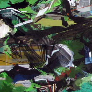 Neatly organized frozen moments are not real. Experience is messy: overlapping reflections, memories clouding the present muddled by competing background noises. The urban environment is a vast sea of fluctuating boundaries arguing claim to the demarcation of space as "wild," "inhabited," "private," "public," "forbidden," and "open." I make sprawling wall-sized and room-sized paintings on Tyvek as a direct response to this environment.