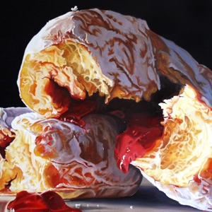In my "Donuts Behaving Badly" series, all forms of debauchery are found. If it is hard to guess what is happening, the painting titles, such as "Binge and Purge", and "The Immaculate Confection" give it away. Donuts are wonderfully fleshy and human, and can lay about with far more lethargy than even a dog on a hot day. The first series used the powdered and overfilled donuts I've purchased from Dunkin Donuts as subjects. The second series contain the more tan and muscular Krispy Kreme donuts acting out "The Seven Deadly Sins".