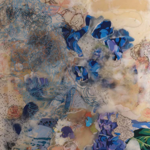 I frequently work with layers of wax and resin that appear charged with expressionistic strokes of color. My technique incorporates cut and glued sheets of partially painted clear acetate once used as palettes for older work. Shielded from total exposure, these colorful abstract fragments appear to float. In addition, I cut Mylar by hand to reference traditional notions of beauty and domesticity.