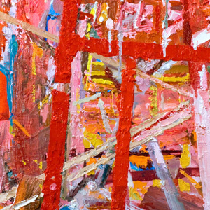 When translated to the language of painting, I am enthralled by how the exoskeletal diagrams of plotters and planners and the traffic of more spontaneous and improvisational paint-handling inform each other.  Invariably, the most memorable images that emerge seem to be those that suggest more than they describe, surfacing some image that lies buried just beneath our waking awareness.  True to the layered and dense nature of my sources, it is in a hybrid space, somewhere between abstraction and figuration, that I find the most room for discovery to occur.