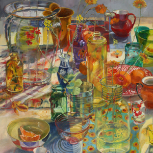 Still life subject matter is the major vehicle for expression. I spend a great deal of time composing a still life and then paint directly from the subject with much careful observation. The background of the still life is just as important as the foreground in my work. I use many approaches to make the background interesting and connected to the whole: including light filled hanging fabrics, bird's eye view point, landscapes and other artist's paintings including my own. I love the nod to the painters I have studied and admired: Matisse, Bonnard, Diebenkorn and more.