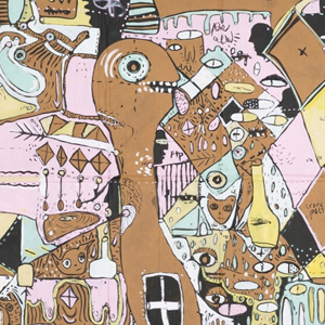 Drawing upon historic and contemporary icons from our unconscious reality, the work explores a sacred/profane dichotomy using mark making generated in a method similar to automatic writing. This content is drawn from myths and is seen in fragmented and compartmentalized layers. Graphic shapes are synthesized into a seamless, cacophonous flow. This is a flow harnessing a frenzied vigor; an energy that ricochets between what confines and what we try to reach.