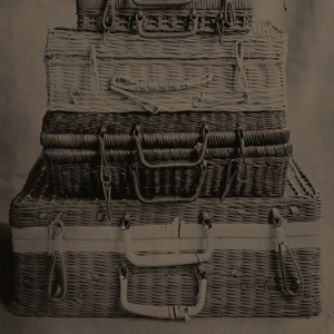 This work employs the 19th century wet-plate collodion process. Rattan Cases is a one-of-a-kind, 4" x 5" ferrotype (tintype).