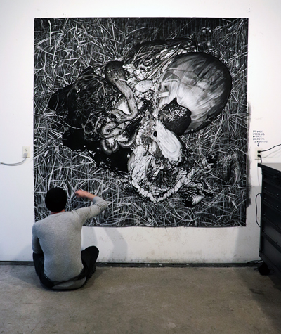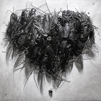 "In these large-scale drawings, I am formally exploring the visual tensions between representation and abstraction, as my observed subjects, masses of black plastic trash bags, piles of cockroaches and sculptures of diapers invoke the sensibility of a Rorschach test for viewers to contemplate. On a conceptual level, it cannot be denied that these subjects also have in common connotations of disposability, decay and, most notably, repulsion, especially for me, as they are manifestations of personal fears and anxieties. The drawings themselves are meticulously rendered to convey the opposite, to be objects that are sumptuous and attractive for the audience, and the act of rendering those things in such scale and detail is a form of individual catharsis. The inherent contrasts between light / dark, representation / abstraction, and attraction / repulsion may call into question what we value in art and in a broader cultural context. I believe that my work fits into the ongoing dialogue that elevates the mundane, the ephemeral or the vulgar to a higher status thereby reflecting parts of society that we often refuse to acknowledge in the mirror of traditional norms.