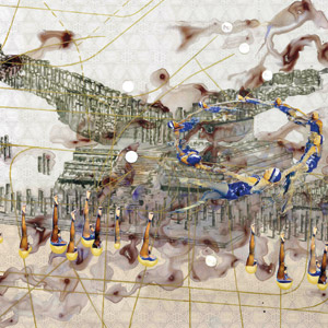 This concept of a hybrid reality can be seen throughout my work through a complex layering of space. Patterns are printed in an underlying rhythm of color and transparency. The reality of the ruin is digitally morphed and then drawn onto the surface to form a suggested space. The fragments of this reality are built upon through various methods to transform the space into an imagined world. Figures move throughout, as characters floating over an environment that adapts and changes. Lines and cords form lyrical movement and suggested dialog. Shapes of light and abstraction are instances of transference. There is an overall sense of the internal fantasy melded with an external reality. The result is a view of invented histories, of fantastically completed fragments showing the connections and disconnections with a past that is not truly known.