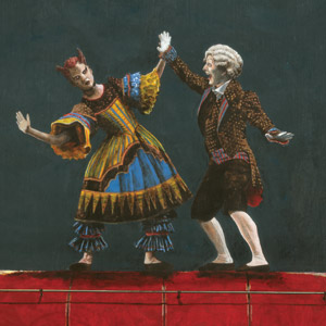 Birds, nudes, harlequins, ballet dancers, antiquated technology and night-lit buildings are used to present a series of paradoxes that hover between the rational and irrational, relating to magical-realist fiction. I like the idea that something can be unbelievable but, on closer inspection, is capable of being rationalised into the everyday. Books such as One Hundred Years of Solitude by Gabriel Garcia Marquez and Nights at the Circus by Angela Carter have helped to inspire my interest in this notion. With this philosophy in mind, much of the imagery is developed from commonplace spectacles such as birds, trains and other wonders that reach beyond the limits of our own relatively immobile bodies. This has also led me to evoke images from silent cinema, where actors might stand atop a train or falter along a window ledge. These antiquated images can seem quaint today, and bring the same sense of nostalgia, innocence, and escapism as a fairytale. The very act of representational drawing and painting might be described as a quaint spectacle of human achievement. I have tried to emphasise this sense of spectacle further through adding a high level of miniature detail to the artworks, with the aid of map pens and acrylic ink.