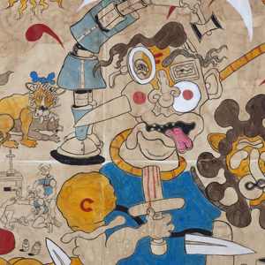 I use the drawing process to examine and combine my interest- abstract figuration, narrative storytelling, pop culture, and symbolic iconography. In There‚s No Place Like Home I interviewed a potential sitter with the idea of creating an portrait composed from memories as the goal. I combined the sitter‚s take on life with my own views of the world. After the interview I was left thinking about life being somewhere in between life in the novel, A Clockwork Orange and The Wizard of Oz. I found it interesting that at the end of each novel the main character just wanted to go home.Finding and understanding home was also the sitter‚s main dilemma in life. It became necessary to include this struggle of finding one's place in the world in this portrait.