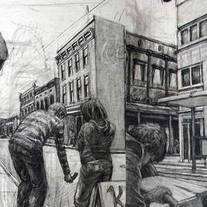 In my recent drawings I explore the relationship between memory and pictorial expression. My imagery is derived from my experience living in Japan between 2003 and 2006, and from my annual returns, as well as from living in the United States: California, Kentucky, Indiana, and most recently, Illinois, which is also where I spent the most time growing up. Referring to remembered visual experiences as well as other resources, such as on site observational drawings and collected photographs of ordinary people and their environments, I work primarily from imagination to initiate my drawings. By focusing on the distinct gestures of human figures, amplifying urban settings, and shifting vantage points between each image, my goal is to establish a new context for daily visual experience and to engage the audience with points of view outside the scope of everyday life.