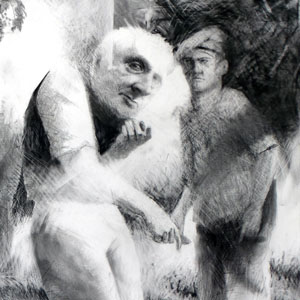 In this series, certain connections have developed between my working practice and the content in my work. The figures in my compositions are drawn or painted from photo-based collages made by recombining parts from various images of men. The collage process references how boys form their concept of male roles, i.e. by piecing together the perceived characteristics of cultural icons and stereotypes with those of influential men in their lives. The awkwardness of the figures resulting from this method reflect both the challenge men face to integrate these disparate qualities and the difficulties they encounter in their efforts to live up to society's ambiguous role expectations. Incompletely rendered forms and evidence of erasure, correction, obfuscation, and expressive processes refer to the actual art-making as well as to the mutability of gender constructs and the struggle boys face in their efforts to forge a masculine identity.