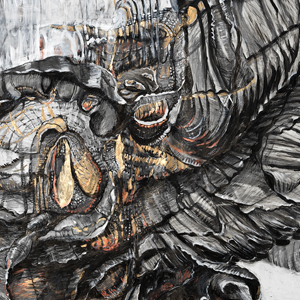 Morphology is the study of form and structure. In an organism, Morphology explores both its outward appearance and its internal anatomy, such as bones and organs. In linguistics, Morphology identifies, analyzes and describes the structure of the basic units of language. In this latest series of large scale drawings, my work process parallels the meaning and practice of Morphology in both its scientific and linguistic senses. I began these drawings by tearing apart portions of early drawings where I first explored the ideas of structure and form, incorporating and combining the pieces into revitalized compositions. This recalls the construction of complete words from sounds, stories from words and sentences, or the growth of a creature's skeletal structure from individual bones and joints. From there, the process of building up with collage and mark-making, and then redaction of the multiple elements into a single unified work, mimics the often chaotic, prolonged sequence of evolutionary development. Wings, feathers, vertebrae, muscle and bone: all are combined in these studies of the form and structure of the internal and external features of imaginary primordial creatures. In Morphology I hope to awaken the viewer's sense of curiosity, astonishment and whimsy, conjuring these beings from the realm of the imagination to life on paper.