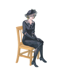 "Wake" depicts a scene that is tinged with the sinister, as the young girls are scrutinized by both the gaze of the viewer and the semicircle of black-veiled women.  Mournful and elegant, the ever-vigilant figures in black have passed from girlhood into the realm of the adult woman, and in turn enforce the guidelines they themselves were raised with.  In contrast, the young girls are grouped as a lively and scattered collective, engaged in play that either reveals their gendered conditioning or resists the ladylike behavior that will soon be expected of them.