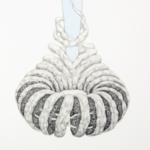 My work is driven by the observed world, and my drawings are a hybrid of the witnessed and the imagined. Subjects and textures in my work come from direct encounters with natural materials and animal husbandry: plants and animal parts, sheep wool and felting processes, grooming tools I've seen in horse barns. My current series presents a marriage of the animate and inanimate. The subjects suggest references both inert and alive, manufactured and organic. These drawings blend functional objects with living surfaces suggestive of tissue, hair, fur or cotton wadding. I have long been fascinated by the use of drawing for scientific and medical purposes. These drawings are presented as specimens, with a high level of description. The technique employed evokes biological illustration in level of information and compositional isolation. Brush #11 and #12 have linear sections with areas of color, alluding to diagrams that contrast with the graphite-rendered areas of simulated texture. Drawing is an ideal medium for speculation, for invention of unlikely hybrids.
