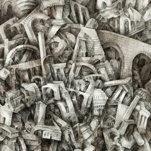 My architecturally based work focuses on cycles of manmade construction and natural decay. In the "Empire" series, thoughts of empires past, present, and future guide my choices in creating a visual language of colossal forms which are simultaneously coming into and fading from existence. In these drawings and paintings, I explore an improvisational approach to building images of invented monumental architecture paralleling the approach in my previous entangled organic drawings. This process often continues to a point where the image erodes leaving only vestiges of the initial form.