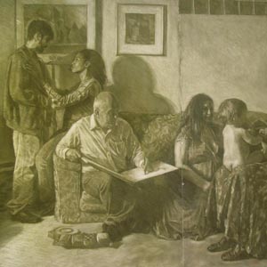 The drawing selected for inclusion in INDA9 is part of a series entitled "Generations" which explores continuities within the generations of my family history. It depicts my wife and me in my studio with our two children and the first of our grandchildren. It is not a "snap shot". I composed it from many preliminary drawing studies because I wanted to give a sense of grandeur and importance to the ensemble paralleling the idea of creating artwork in the studio with the idea of creation in terms of the growing family. Drawing is the foundation of everything I do as an artist. For me drawing means a clear, harmonious depiction of form in space through a controlled use of light and dark values. It is the principle way I work out the organization of my paintings. It is visual thinking.