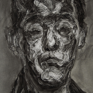 The drawing included in this publication is one more example of the "mute image", the artist's obstinate effort to overcome its very refusal to speak simultaneously being its generative force. Translated from careful observation of an impastoed canvas, Rivers Grow Small obtains a dual appearance: its marks can refer to either the flat surface of a painting, or the three-dimensional surface of the figure. Yet the drawing was made by repeating only what's given in a painted original—so where did this extra otherness come from? Perhaps it is the signature of the act of repetition itself. This trace—analogous to that which exists "between the lines" of text—reveals itself alongside a few actual words of rendered script, taken from the poem of the same title. Together, they evoke a sense of what it may mean to return to the sites of the past.