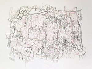 Both borrowing from and subverting my training as an architect, I'm interested in exploring drawing as a process that merges the physical and mental landscape. The result is an ambiguous articulation of labyrinthian space, scale, and detail. As opposed to the Renaissance ideal of the one-point perspective, I depict a multiplicity of lines both extruded and intersecting, which require the viewer a constant repositioning. At times from