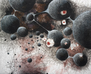 This frustration evolved into a dramatic artistic redirection. Although I am still immensely inspired by microscopic imagery, I am no longer concerned with the fidelity of my representations. I instead use these forms freely as elements within my imaginative microscopic landscapes. Formally, I look for a natural order, an honest spontaneity and the narrow space within which these two elements maintain a compelling equilibrium. The search for this narrow space is the essence of my artistic drive. The process of making has become an internal performance, an acting out and a reigning in. At its most basic level I create mess, chaos and destruction solely for the satisfaction of finding and pulling out order, structure and calm. It is an act of reassurance and of hope; an odd construct for exacting control and having a say.