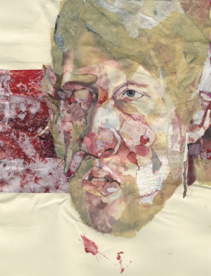 I would be false if I said that I had a definitive vision to communicate. I use drawing the way one might use a shovel to turn over the earth--I draw to burrow under the surface of things. I use what I know about rendering portraits in order to learn more about them. At this moment, the line between power and vulnerablity and between abuse of power and victimization is a fluid one for me. The same is true of self and other. I observe one stance, one orientation, and immediately see its underside. Lately I have observed a new and more physical effect of power on and in the body itself, often disfiguring, never static, always human. I use collage and water color. Collage allows me to work with existing surfaces as I create my own. Both collage and water color express a mutability that suggests transience and change.