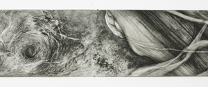 Groundwork is a thirty-three foot drawing that maps a journey in pencil on paper. This linear map requires the participant to physically travel through space in order to see the visual representation of the journey. It is a spiritual journey, as well, beginning with imagery that is familiar and safe, but quickly plunging into a dark and more forbidding place, finally ending up in a state of altered reality.