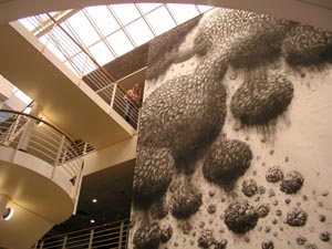 As a busy graduate, I struggle to find enough time for my own work. This past summer I was lent a small cottage on the sea for a week allowing me to absorb the beauty of the Scottish coastline and easy access to my work created on the floor of the Demarco Barn Gallery in Skateraw. Fission II is based on the chain reactions that go on to produce energy and how only tiny elements and particles can ultimately produce vast amounts of energy. This compares to the relatively small number of people working at the power station who contribute to a greater network of energy for communities in Britain. The hands are imporant because they represent the uniquely individual tools/symbols with which we all work. As a student I had been interested in the physics of energy, thermodynamics, states or order and disorder and how all of this tied into the process and repetition in making art and processes and repetition in nature. Fission, as a term in history, was originally only used for the division of living cells so the drawing's association with living things recalls its past.