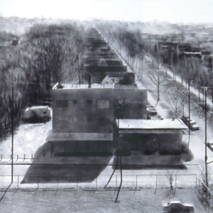 I make drawings and prints in black and white. The drawings are charcoal on paper and the prints intaglio etching and acquatint. The imagery is always collected with a 35mm camera and color film, which seems to offer more information from which to choose. Although I use no photomechanical or tracing process, photography plays an important conceptual role, enforcing an implacable objectivity that accepts whatever presents itself to the camera, without regard to human intention. Composition takes place in the studio, where the images are cropped or combined in the process of drawing.