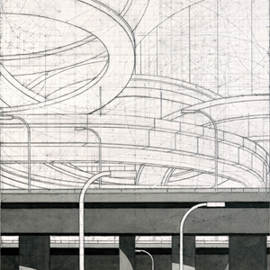 The way we move through the environment is analogous to this drawing process. The infrastructure of our cities and towns move out into the landscape and as it progresses, it divides, delineates and reorders. Various construction, completed and in progress, is fused with the environment, developing a muscular ability to redirect and alter progress, direction and perception. Each road, building, bridge and parcel of land becomes part of an equation that is still in the process of defining itself. The landscape becomes the residue of a long series of shifts in aesthetics, politics and necessity; its sum being one of accumulation.